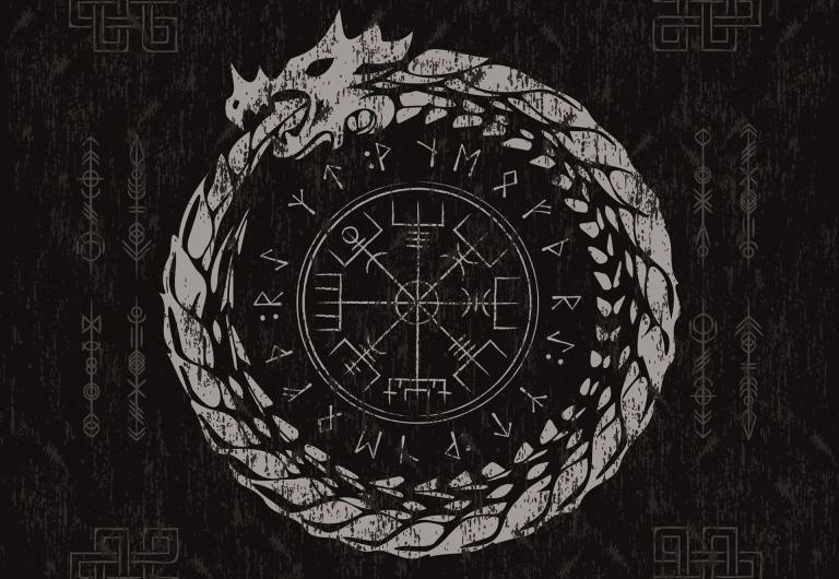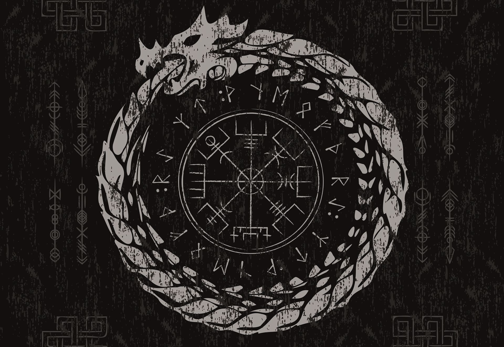 Im Zentrum steht der Vegvísir, der isländische »Wegweiser«. Dieses Schutzsymbol soll seinem Träger helfen, niemals den Weg zu verlieren – selbst unter stürmischen Himmeln. Umrahmt wird es vom Jörmungandr, der mythischen Midgardschlange, die sich selbst in den Schwanz beißt – ein Sinnbild für den ewigen Kreislauf des Lebens. Fein gearbeitete Runenreihen und symbolische Muster an den Rändern verleihen dem Segel eine tiefgründige, mystische Aura.